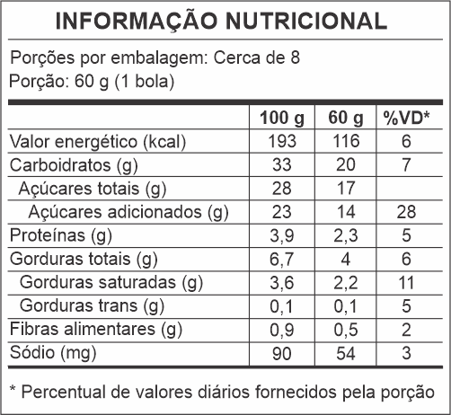 Ingredientes: Água, doce de amendoim (soro do leite, doce de leite, amendoim), açúcar, leite em pó integral, xarope de glucose, gordura vegetal, cacau em pó, estabilizante e emulsificante em pó para gelados comestíveis (emulsificante: monoglicerídeos de ácidos graxos destilados, espessantes: carboximetilcelulose (CMC), goma guar, carragena e goma xantana, estabilizante: tripolifosfato de sódio), emulsificante em gel (emulsificantes monoglicerídeo destilado de ácidos graxos, monoestearato de sorbitana e estearato de potássio). ALÉRGICOS: CONTÉM AMENDOIM, LEITE E DERIVADOS DE SOJA E LEITE. CONTEM LACTOSE. CONTÉM GLÚTEN.
