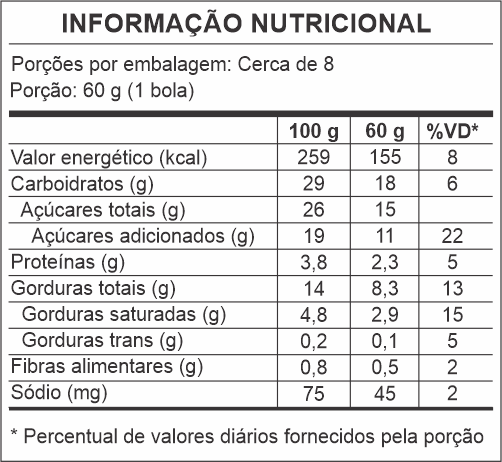 Ingredientes: Água, recheio sabor avelã, leite em pó integral, pasta saborizante de açúcar (aroma sintético idêntico ao natural), açúcar, xarope de glucose, gordura vegetal, estabilizante e emulsificante em pó para gelados comestíveis (emulsificante: monoglicerídeos de ácidos graxos destilados, espessantes: carboximetilcelulose (CMC), goma guar, carragena e goma xantana, estabilizante: tripolifosfato de sódio), emulsificante em gel (emulsificantes monoglicerídeo destilado de ácidos graxos, monoestearato de sorbitana e estearato de potássio). ALÉRGICOS: CONTÉM AVELÃ, DERIVADOS DE SOJA E LEITE. CONTEM LACTOSE. CONTÉM GLÚTEN.